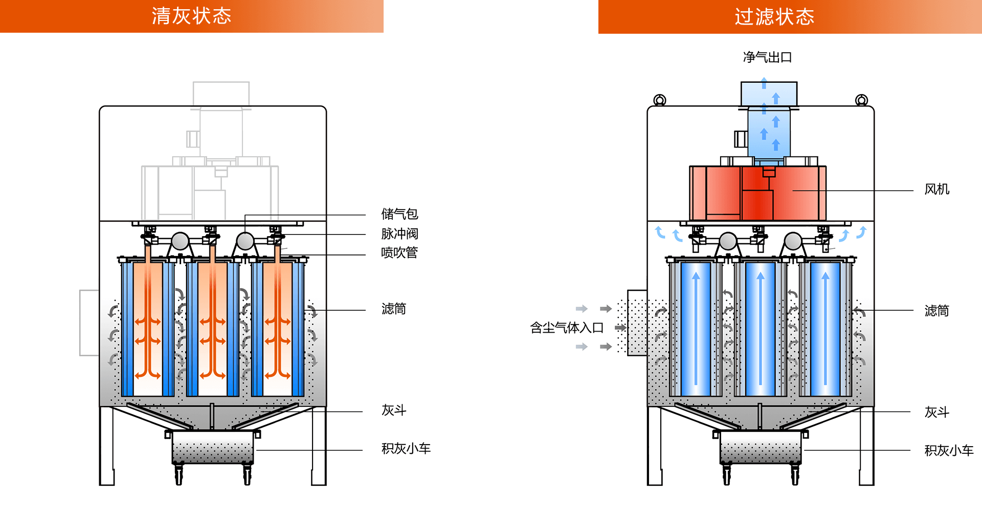 通過(guò)反復(fù)小幅度的沖擊振動(dòng),將積聚在濾筒外部的粉塵震落至灰斗內(nèi)。
