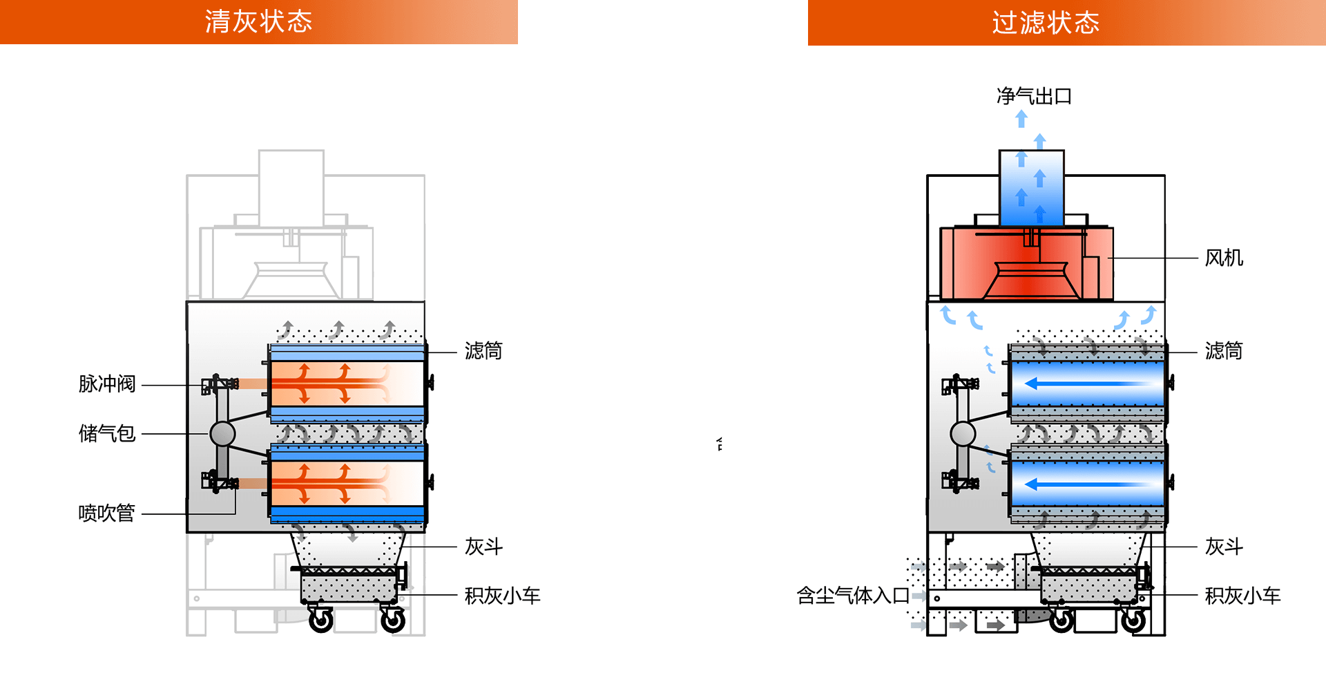 通過反復(fù)小幅度的沖擊振動,將積聚在濾筒外部的粉塵震落至灰斗內(nèi)。