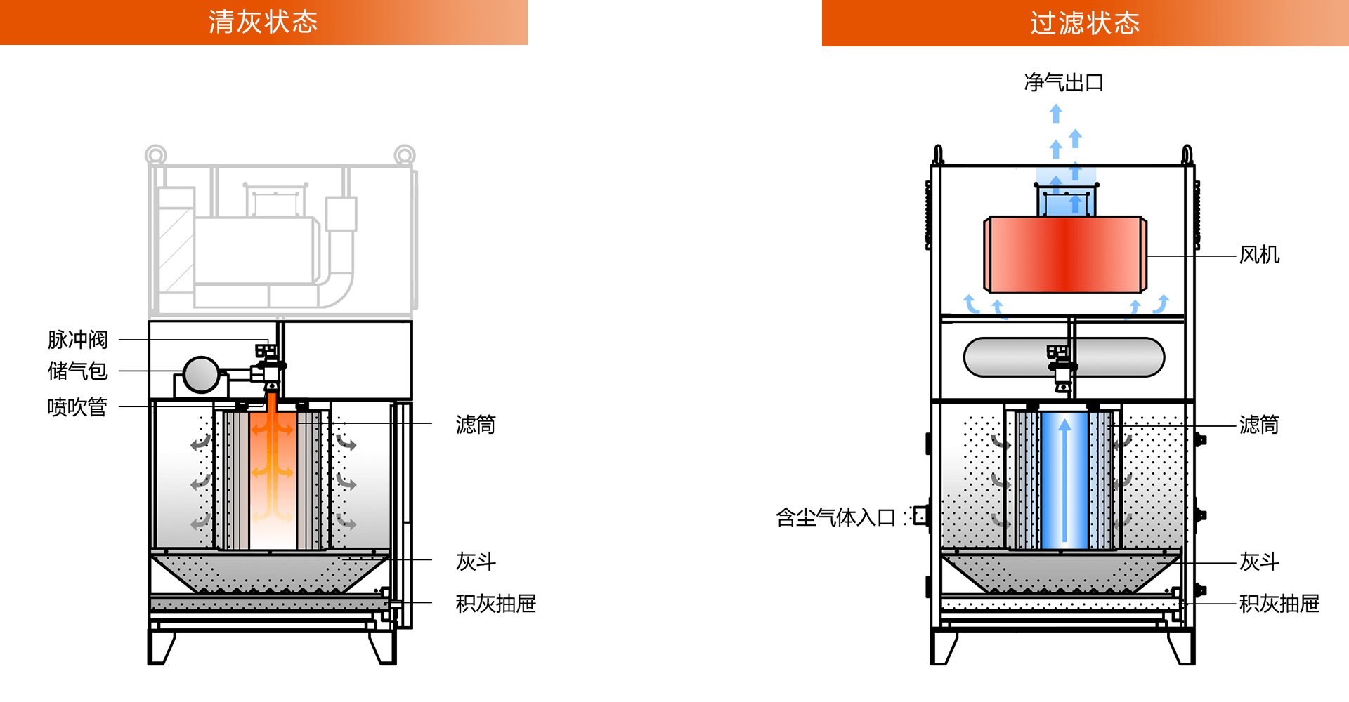 通過反復(fù)小幅度的沖擊振動(dòng),將積聚在濾筒外部的粉塵震落至灰斗內(nèi)。